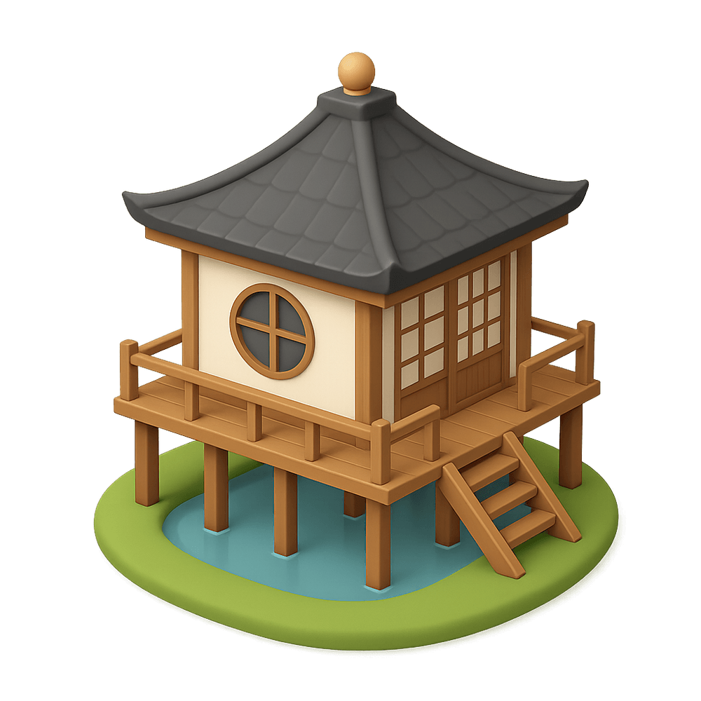 A traditional tea house elevated on stilts, often found in scenic or wetland areas. Designed to offer tranquil views and a serene atmosphere for tea ceremonies or relaxation, these structures blend architecture with nature.