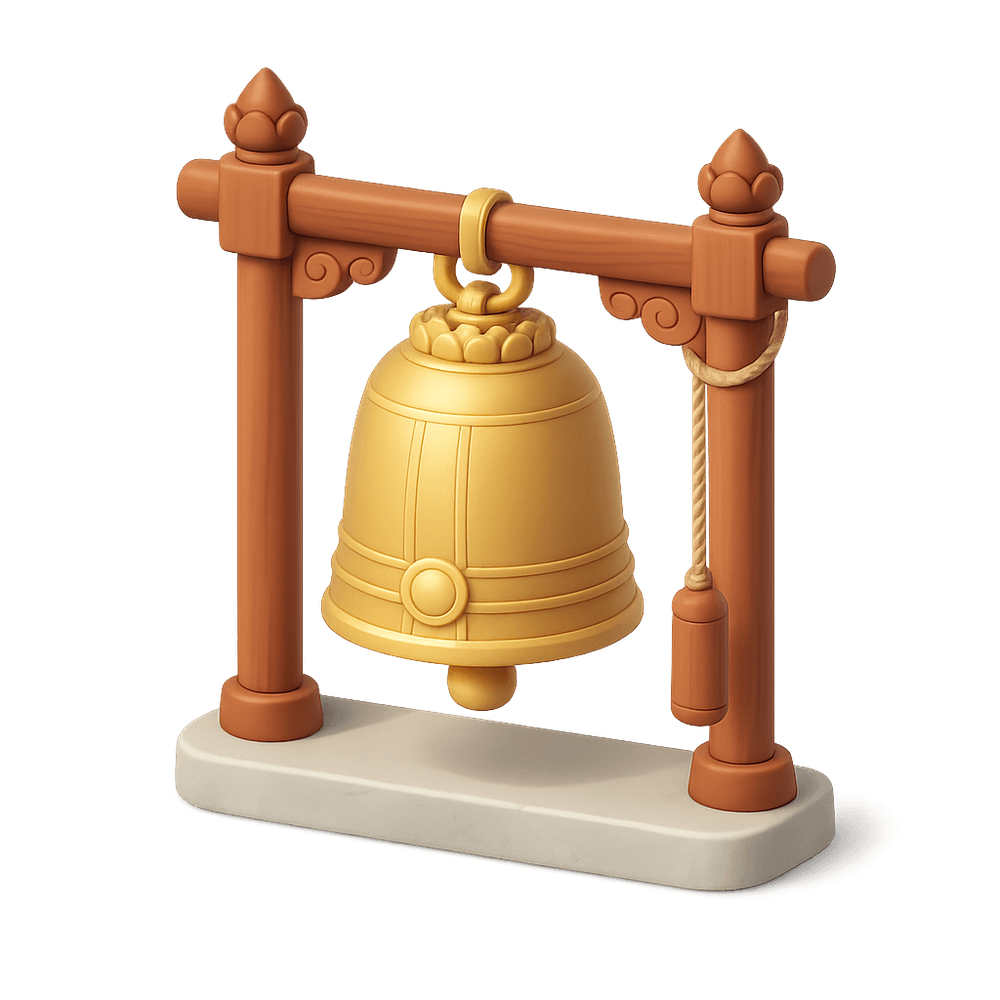 A large, often ornate bell traditionally found in temples, used in religious ceremonies, rituals, and to mark the passage of time. Temple bells are significant in many cultures, symbolizing spirituality, community, and the call to prayer or meditation.