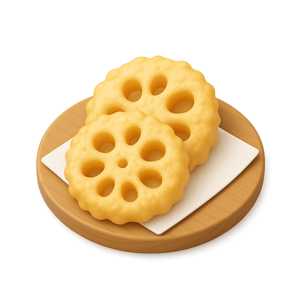 Tempura Lotus Root is a Japanese dish featuring slices of lotus root coated in a light, crispy tempura batter and deep-fried until golden. It is enjoyed as a savory appetizer or side dish, prized for its crunchy texture and mild, earthy flavor.