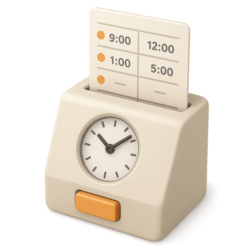 A time card is a document or digital record used by employees to track the hours they have worked. It is commonly used in workplaces to record start and end times, breaks, and total hours for payroll and attendance purposes.