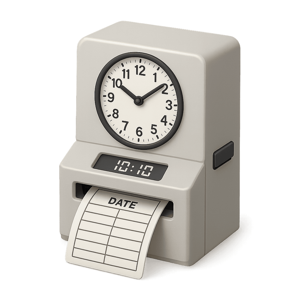 A time clock, also known as a punch clock or clock card machine, is a device used in workplaces to record the start and end times of employees' work shifts. Employees insert a card or use a digital interface to log their working hours, helping employers track attendance and calculate payroll. Time clocks are commonly found in factories, offices, and other industrial or commercial settings.