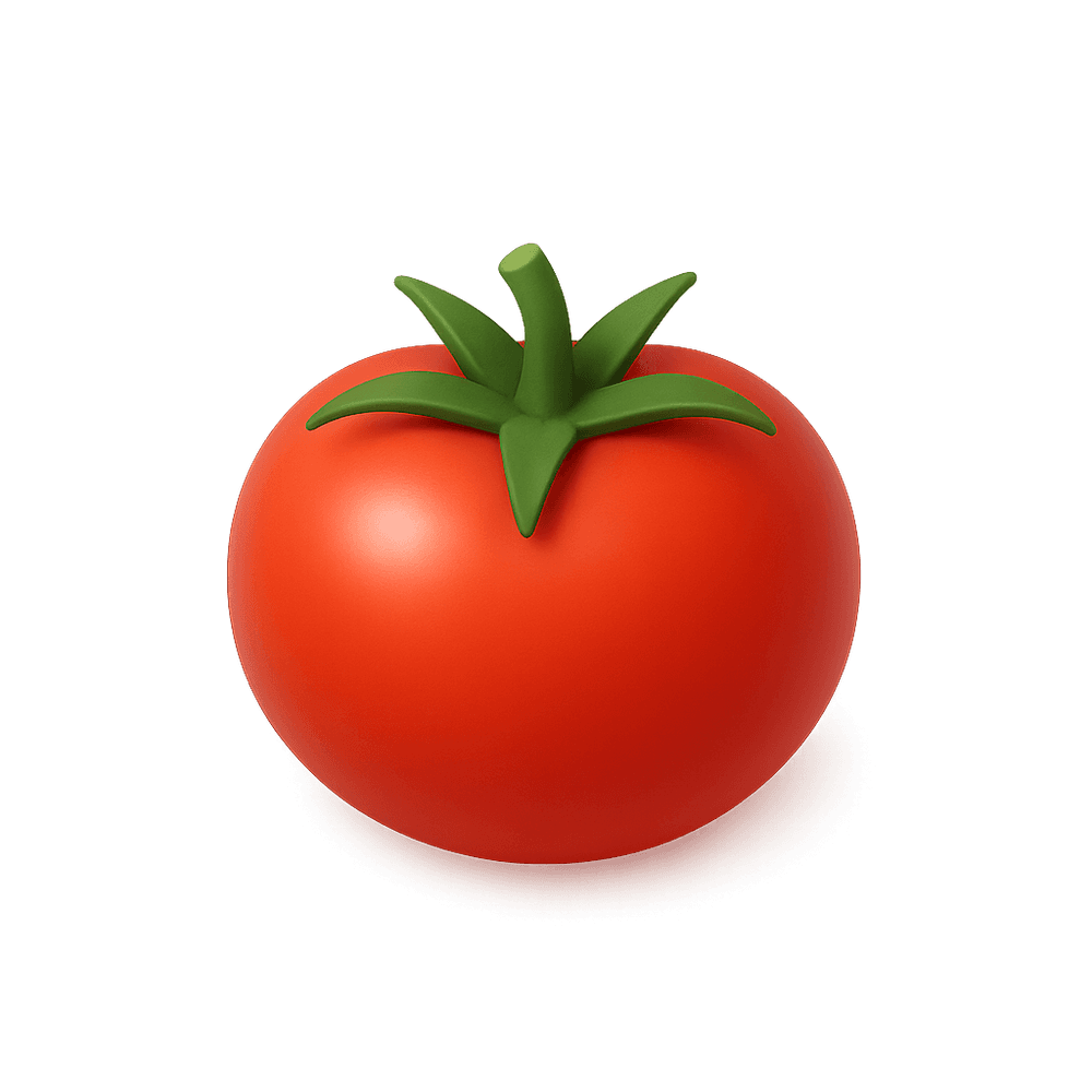 A round, red fruit commonly used in cooking and salads. Tomatoes are a staple ingredient in many cuisines around the world and can be eaten raw or cooked. They are known for their juicy texture and slightly tangy flavor.
