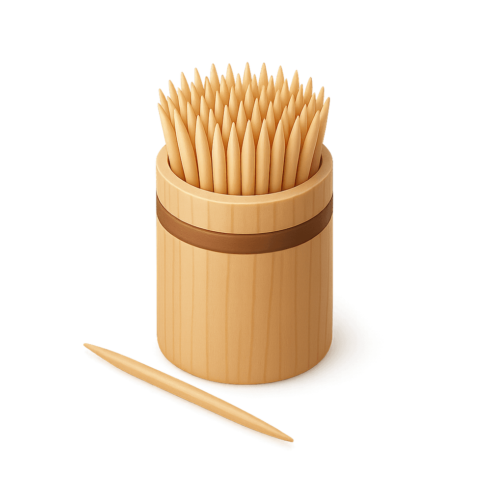 A small, slender stick used for removing food particles from between the teeth after eating. Toothpicks are commonly made from wood, plastic, or bamboo and are a basic item found in many households and restaurants for personal oral hygiene.