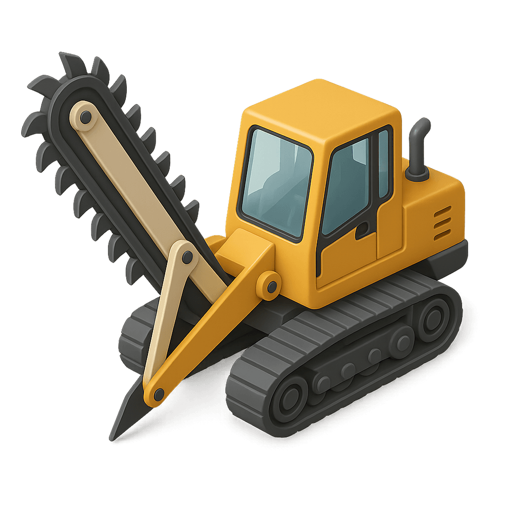 A trencher is a piece of heavy equipment used in construction and civil engineering to dig trenches, typically for laying pipes, cables, or drainage. It features a powerful digging mechanism that efficiently cuts through soil and rock.