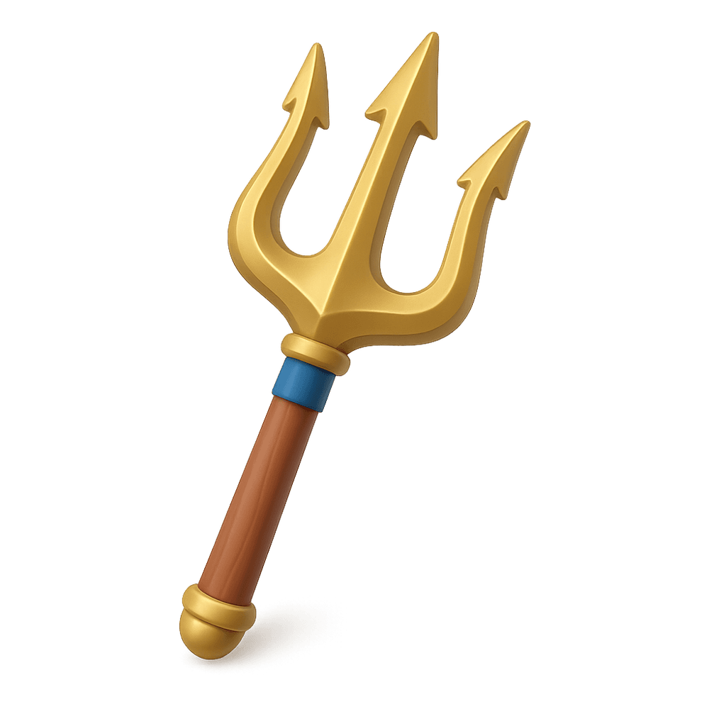 A trident is a three-pronged spear often associated with mythological gods like Poseidon or Neptune. In fantasy and imagination, it symbolizes power over the sea, magic, and authority. Tridents are iconic weapons in many legends and stories.