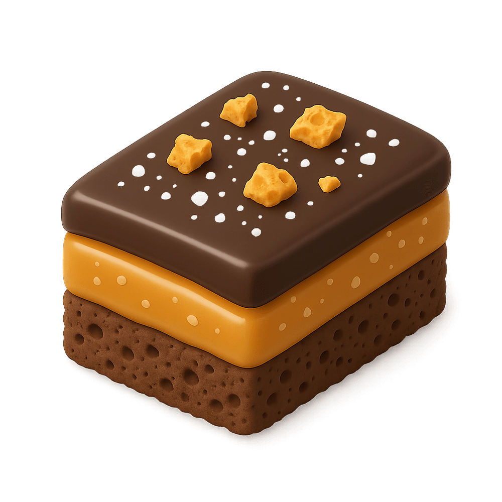 A decadent snack bar featuring three layers of crispy crunch, gooey caramel, and rich chocolate, perfect for satisfying sweet cravings.