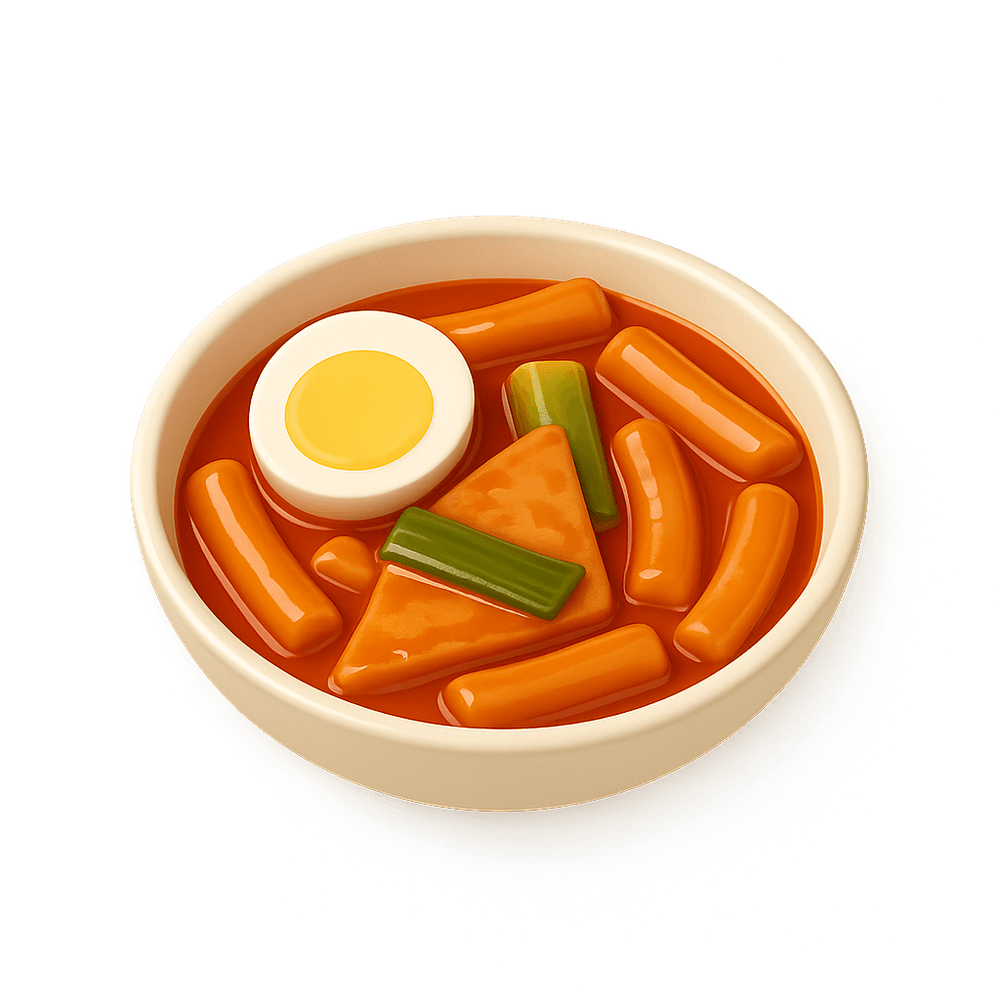 Tteokbokki is a popular Korean street food made from chewy rice cakes simmered in a spicy, sweet, and savory gochujang-based sauce, often served with fish cakes and vegetables.