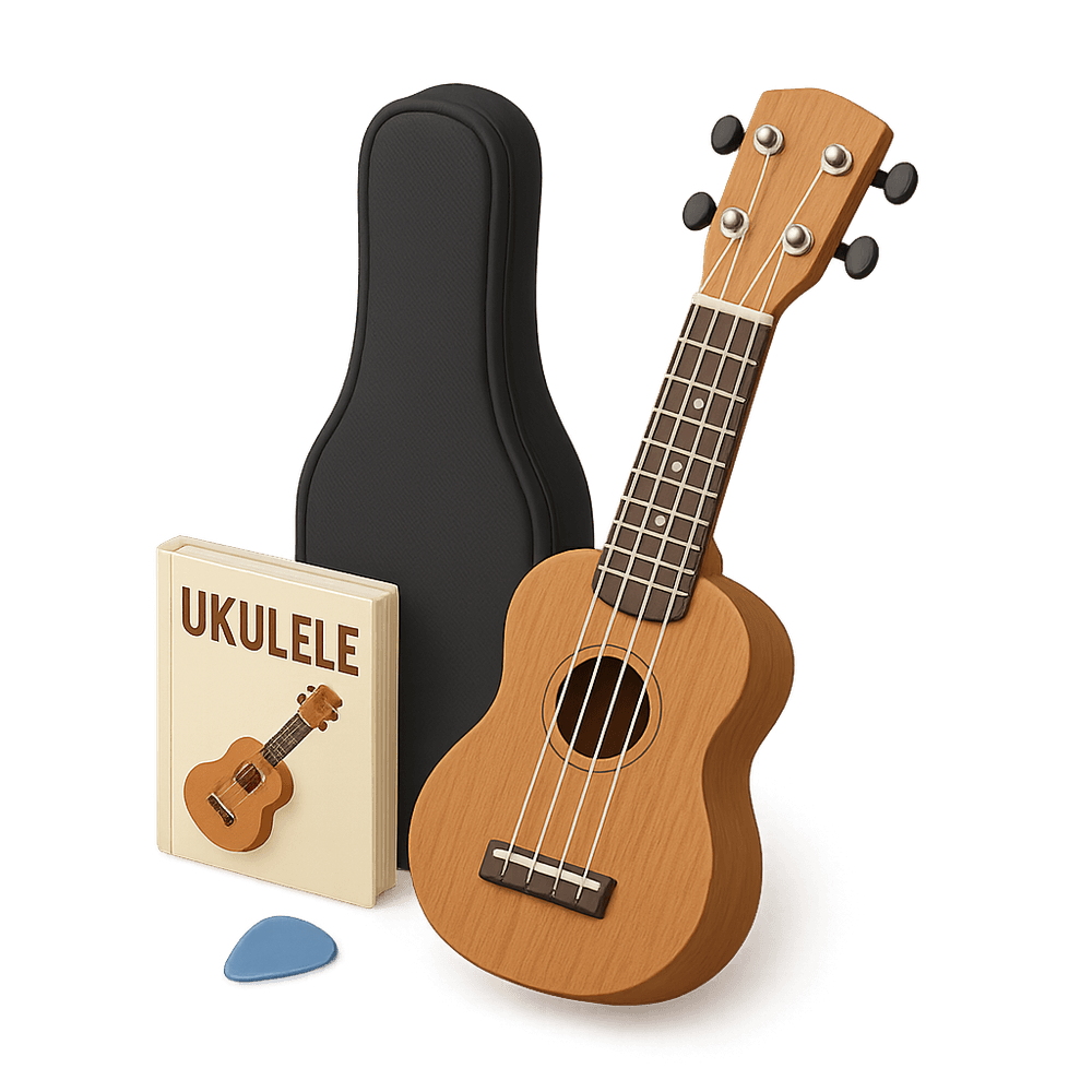 A beginner-friendly ukulele kit that includes a soprano ukulele, carrying case, digital tuner, extra strings, and a beginner's songbook. Perfect for those interested in learning a musical instrument as a hobby.