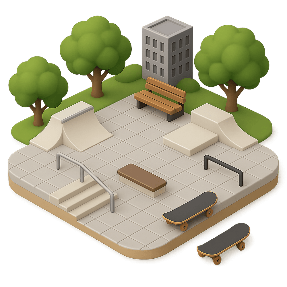 A purpose-built public space designed for skateboarding, featuring ramps, rails, ledges, and open areas for tricks and social gatherings. Often located in urban environments, these plazas encourage recreation, community, and youth culture.