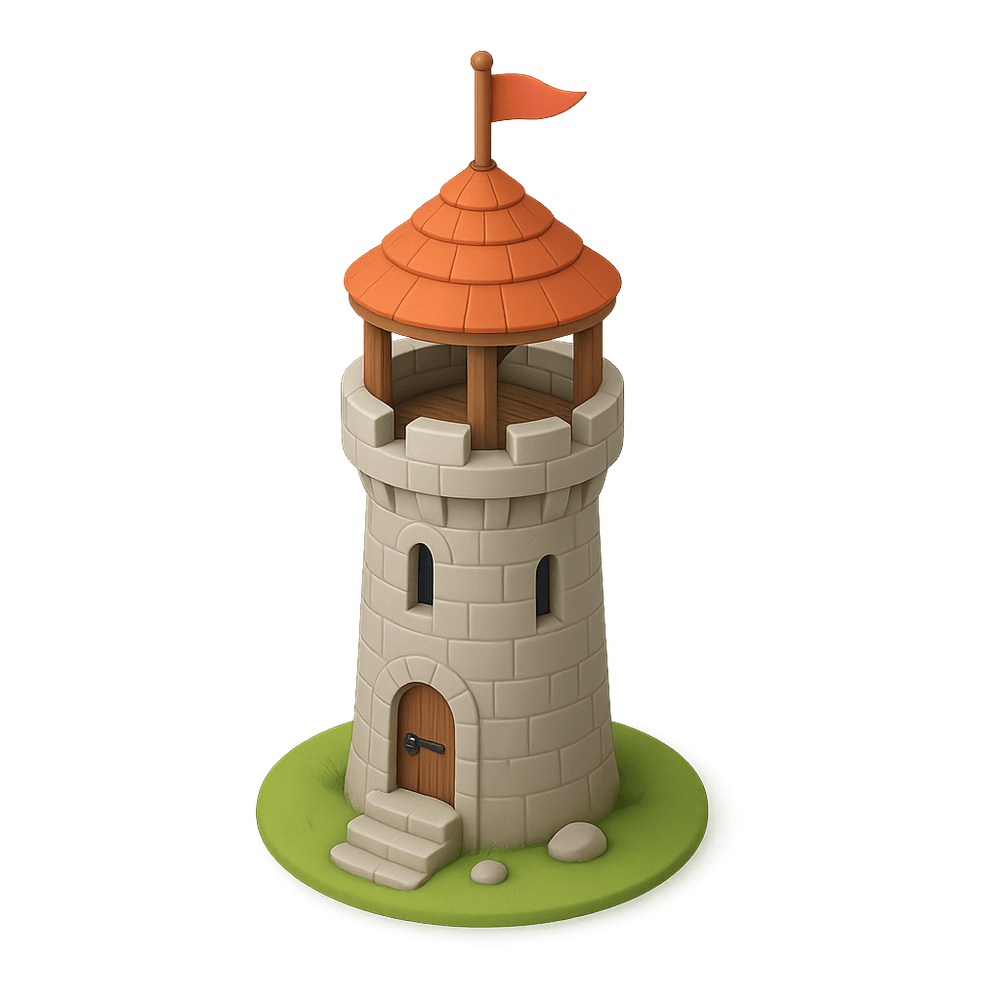 A watchtower is a tall structure built to provide a high vantage point for observing the surrounding area, often used for surveillance, defense, or fire spotting. Historically, watchtowers have been important for security and early warning systems in both urban and rural settings.