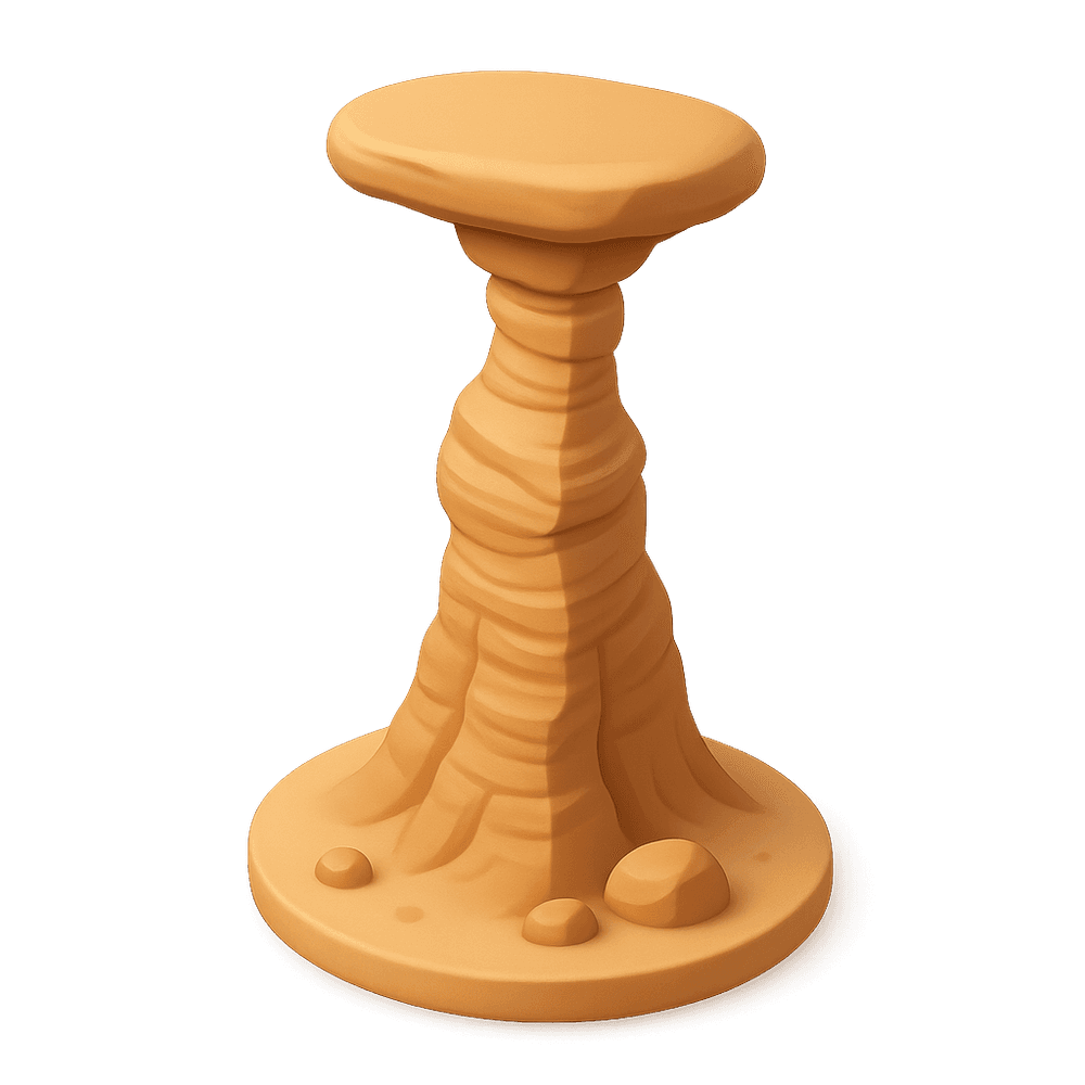 A wind-carved hoodoo is a tall, thin spire of rock that protrudes from the bottom of arid basins and badlands, shaped by years of wind and water erosion. These natural formations are often found in desert landscapes and are known for their unique, dramatic shapes.