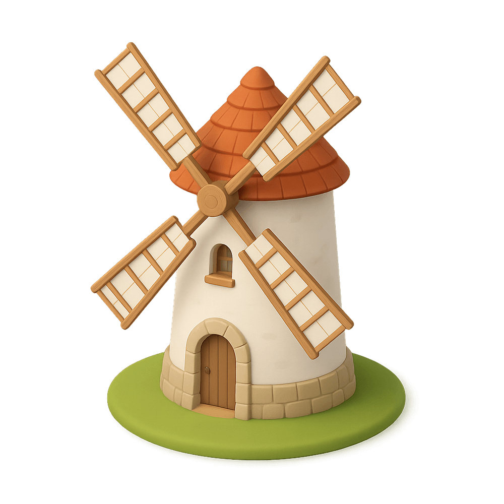 A windmill is a tall structure with rotating blades, traditionally used to harness wind energy for milling grain or pumping water. Often found in rural landscapes, windmills are iconic landmarks and symbols of sustainable energy.