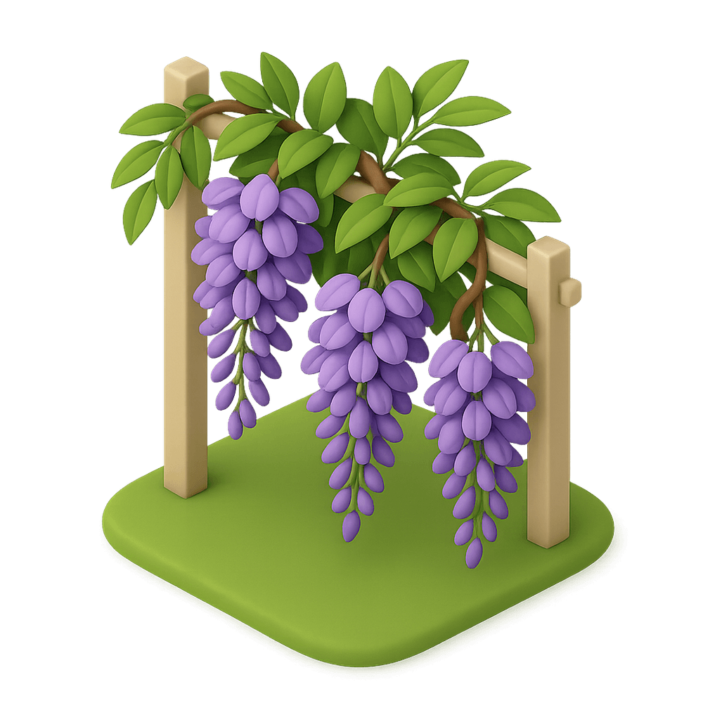 A Wisteria Vine is a climbing, flowering plant known for its cascading clusters of fragrant purple or white blossoms. Often used to decorate gardens, trellises, and pergolas, it adds beauty and shade to outdoor spaces.