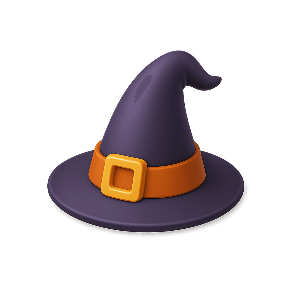 A pointed, wide-brimmed hat traditionally worn by witches in folklore and fantasy stories. Often associated with magic, mystery, and spellcasting, the witch's hat is an iconic symbol in fantasy and Halloween imagery.