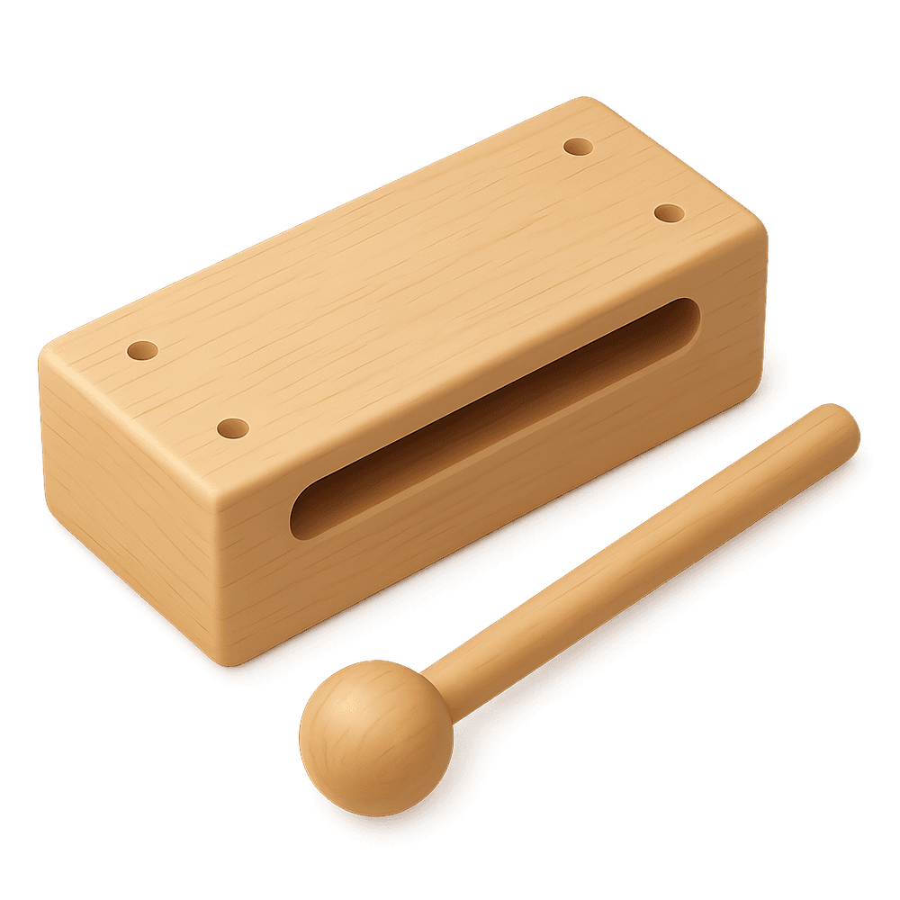 A woodblock is a percussion instrument made from a single piece of wood, commonly used in music and performance to create a sharp, resonant sound when struck. It is often featured in orchestras, bands, and traditional music ensembles.
