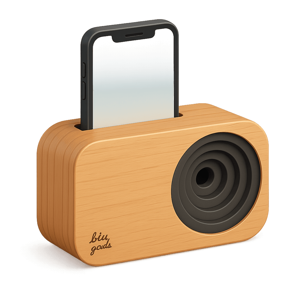 A compact, eco-friendly speaker made from wood that amplifies sound from a smartphone without the need for electricity. Ideal for casual listening and enhancing audio experiences naturally.